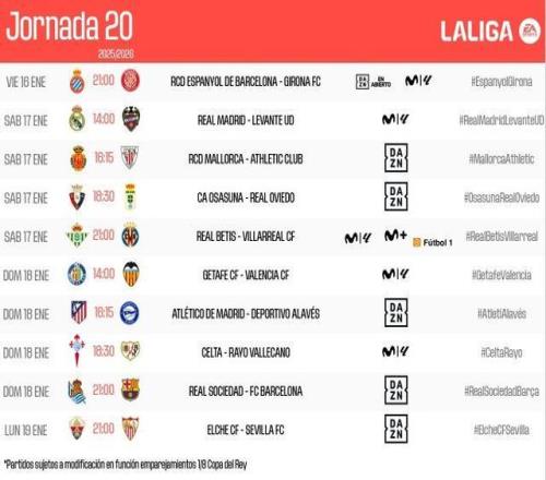 西甲官方公布了第20轮比赛开球时间,皇马vs莱万特将于北京时间1月17日21:00开打,皇家社会vs巴萨将于北京时间1...