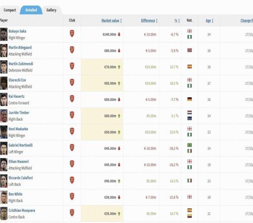 北京时间10月17日,德转更新了英超球员身价,阿森纳身价变动球员如下。萨卡,下跌1000万欧,现身价1.4亿欧厄德高,下...