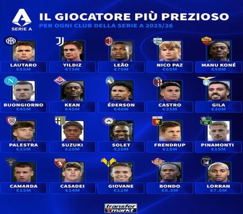德转列意甲各队身价第一:劳塔罗8500万欧领衔,最低仅750万