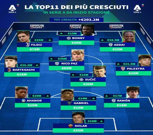 北京时间12月23日,在更新了意甲球员的身价之后,德转还列出了自2025-26赛季开始后,身价涨幅最高的11人阵容,尼科-...