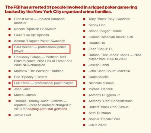 FBI公布了“老千案”中逮捕的31人,可以看到除了黑手党成员、NBA球员外,还有两名职业扑克玩家,人家靠这手艺吃饭的,想赢普通人不要太简单......