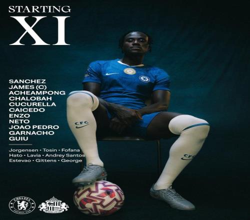 切尔西首发:1-桑切斯、24-詹姆斯、34-阿昌庞、23-查洛巴、3-库库雷利亚、25-凯塞多、8-恩佐-费尔南德斯、7-内托、49-加纳乔、20-若昂-佩德罗、38-吉乌
