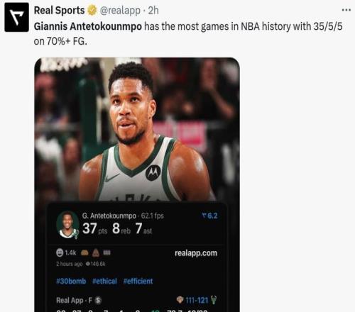同时开季至今,字母哥一直保持着恐怖的进攻效率,本场再次以至少70%命中率拿到35+5+5后,让其成为NBA历史上交出这一表现次数最多的球员。