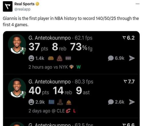 凭借这样的表现,字母哥开季至今已经拿下145分56篮板28助攻,成为NBA历史上首位在前四场比赛就能达成140分50板25助攻的球员。