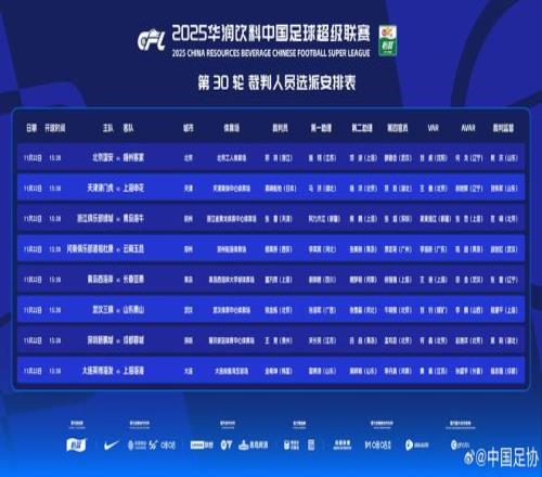 北京时间11月22日,中国足协公布中超最后一轮裁判安排:韩国籍裁判执法海港客战英博,日本籍裁判执法申花客战津门虎。