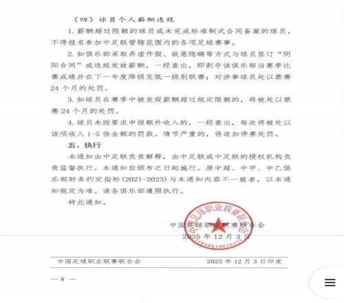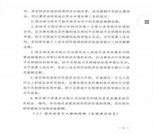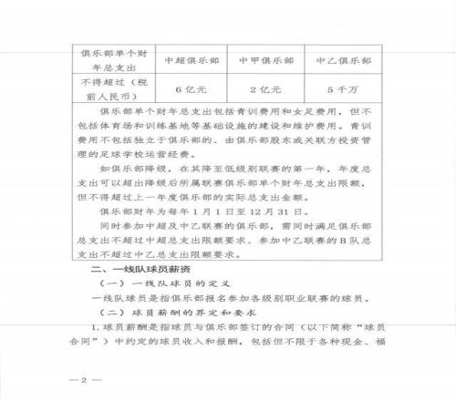 据足球报报道,12月3日下午,中足联发布《中国足球职业联赛俱乐部财务约定指标》,对职业俱乐部一线队球员薪资做出了详细规定: