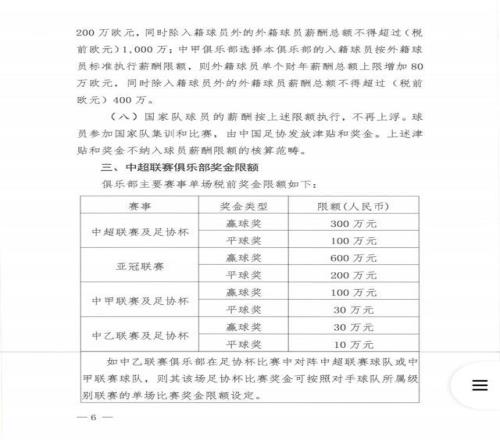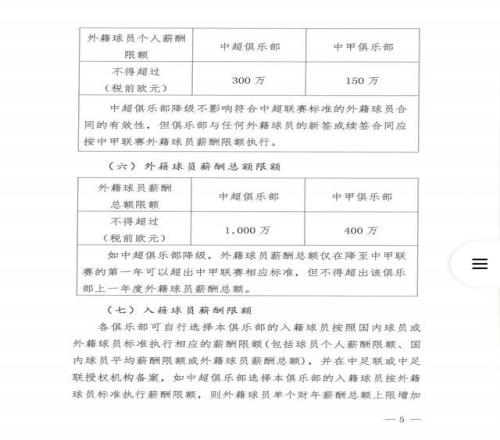 中超俱乐部外援个人薪酬不得超过300万欧元(税前),中甲俱乐部外援个人薪酬不得超过150万欧元(税前)。