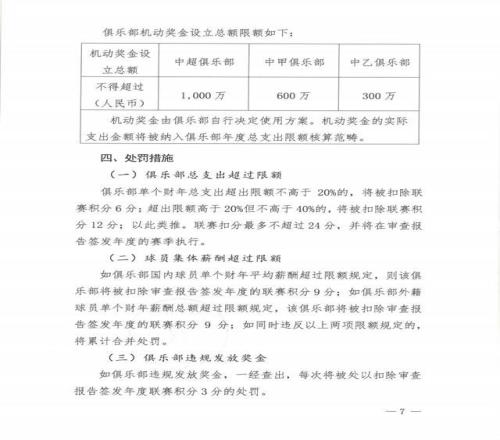 中超俱乐部外援薪酬总额不得超过1000万欧元(税前),中甲俱乐部外援薪酬总额不得超过400万欧元(税前)。中超俱乐部国内球员平均薪酬限额不得超过500万元(税前),中甲国内球员平均薪酬限额不得超过300万元(税前),中乙国内球员平均薪酬限额不得超过50万元(税前)。
