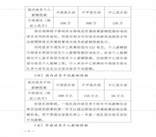 中超俱乐部国内球员个人薪酬不得超过500万元(税前),中甲国内球员个人薪酬不得超过300万元(税前),中乙国内球员个人薪酬不得超过120万。